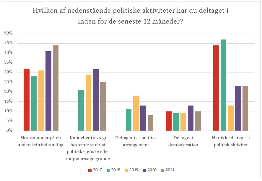 Og mens COVID-19-pandemien har holdt danskere fra at kunne deltage i fysiske aktiviteter, så har unge rykket deres samfundsengagement andre steder hen ved eksempelvis at skrive under på underskriftindsamlinger eller skrive debatindlæg.
